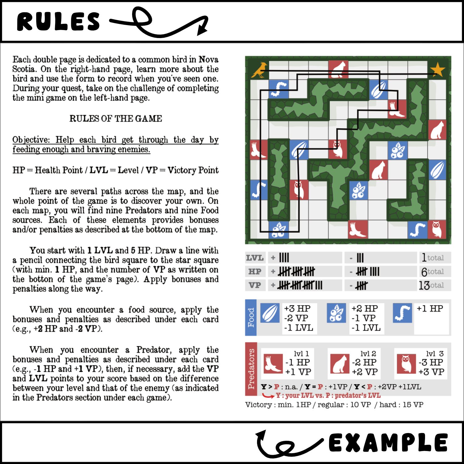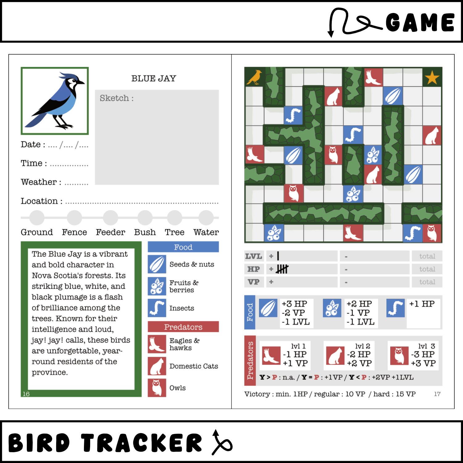 Track 42 local birds of Nova Scotia in the real world on the left page, then dive into a "dungeon-crawler" challenge on the right, where you help each bird navigate to food and safety.